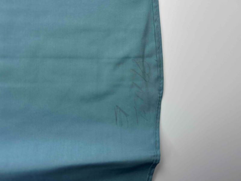 生地のハリが強く残ったデッドストック(未使用)コンディションです。裾付近に製造時または保管時についたと思われるサイン(書き込み)が見受けられますが(画像参照)、その他目立つ汚れやダメージはなく、極めて良好な状態を保っています。
