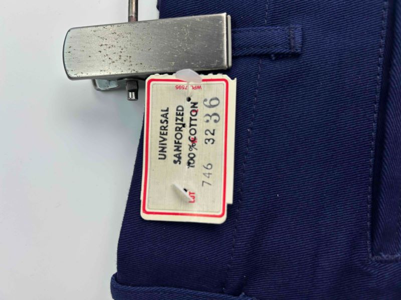 当時のフラッシャー(販促ラベル)がある。完全なデッドストック(未使用新品)。現行品に多いポリエステル混紡ではなく、風合い豊かなコットン100%のサージ(ツイル)生地を使用した、ヴィンテージファン垂涎の仕様です。