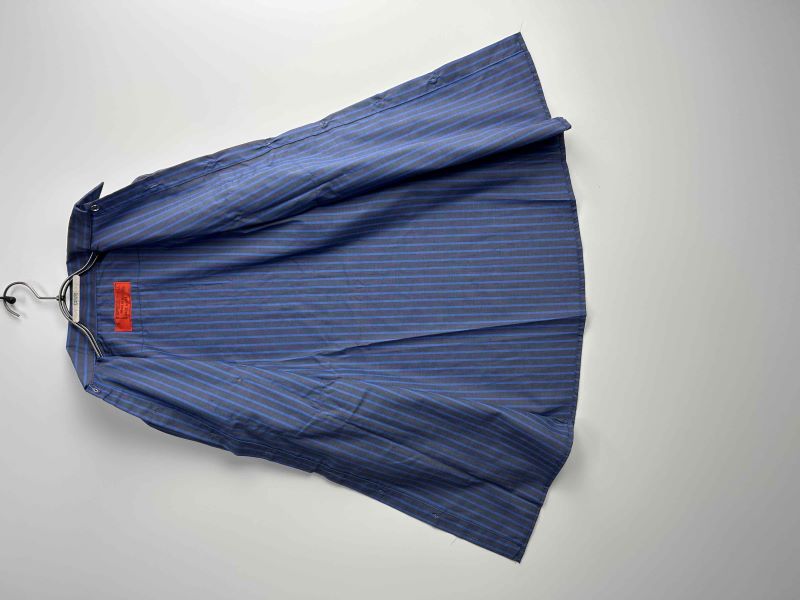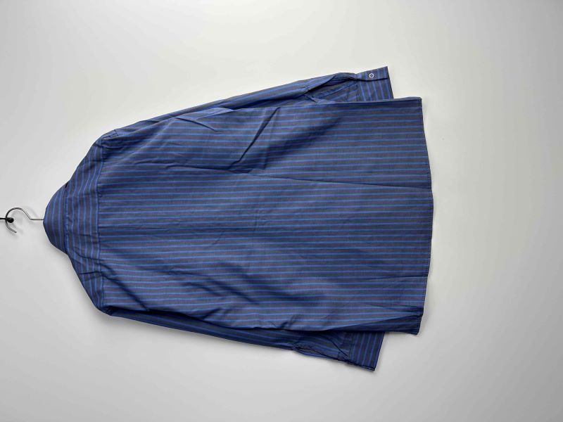 仕様: 両胸にボタン付きパッチポケット。袖口は1ボタン仕様。青と黒(紺)の縦縞ストライプ柄。