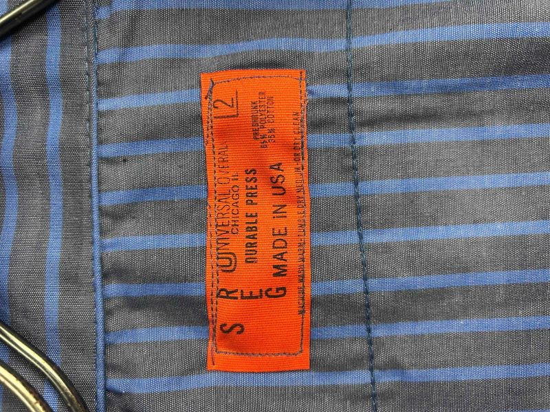 ■アイテム解説 老舗ワークウェアメーカー、UNIVERSAL OVERALLのストライプ柄長袖ワークシャツです。首元のオレンジ色のラベルに「MADE IN USA」の表記があるヴィンテージ個体。形態安定性に優れた「DURABLE PRESS」仕様で、実用性とクラシックな雰囲気を兼ね備えた一着です。