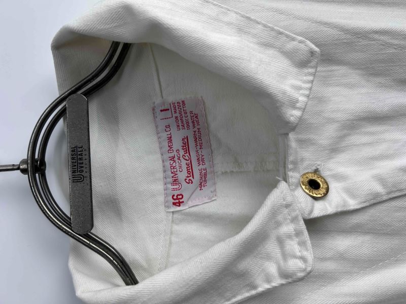アメリカ・シカゴの老舗ワークウェアブランド、UNIVERSAL OVERALL(ユニバーサルオーバーオール)の希少な派生ライン「Stone Cutter(ストーンカッター)」のオールインワン(つなぎ)です。 清潔感がありながらも無骨なホワイトヘリンボーンツイル生地を採用した、市場でも流通の少ないレアモデル。1980年代〜90年代の「MADE IN U.S.A.」個体です。