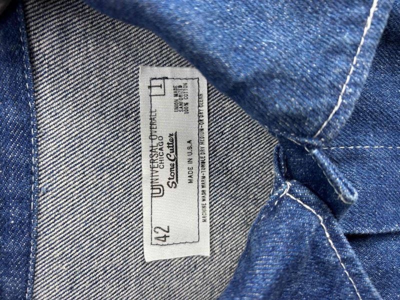 アメリカンワークウェアの雄、UNIVERSAL OVERALL(ユニバーサルオーバーオール)社製のデニムカバーオールです。 特筆すべきは、同社の希少なブランドラインである「Stone Cutter(ストーンカッター)」の刺繍タグが備わっている点。さらに、アメリカの労働組合に加盟している証である「ユニオンチケット(AFL-CIO / United Workers)」が左ポケット内部に残っており、1980年代から90年代にかけての正真正銘「Made in U.S.A.」のヴィンテージ・アーカイブです。